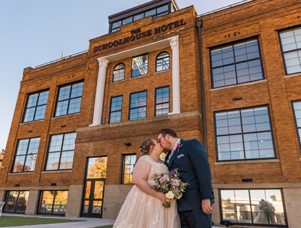Located in White Sulphur Springs, WV, The Schoolhouse Hotel is a distinctive and memorable venue for weddings, blending modern comforts with historic charm. Housed in a restored 1912 school building, the hotel features 30 guest rooms, a large lobby with a bar and restaurant, a rooftop bar and a versatile ballroom that can accommodate intimate dinners as well as lively celebrations. Couples can choose from indoor spaces, the front lawn or a nearby historic church for ceremonies, while receptions can be customized with dining, dancing and decorations. The ballroom’s stage can accommodate large bands as well. With on-site event support, flexible packages and a warm, locally inspired atmosphere, this venue provides all the necessities to host an unforgettable wedding.